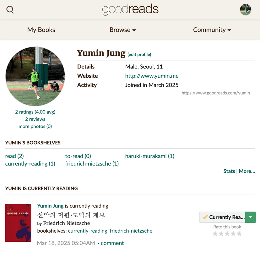 최근 책을 읽으면 독후감을 쓰려는 습관을 들이고 있는데, 내 리뷰를 기록하고 저장하는 동시에, 다른 사람들의 리뷰를 볼 수 있는 방법이 있을까 하다가 goodreads를 알게 되어 시작했다.